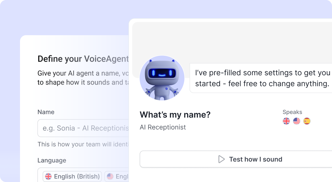 Name your agent, choose its language and voice, and define how it greets callers. This is where you shape how the agent sounds and how it introduces your company.