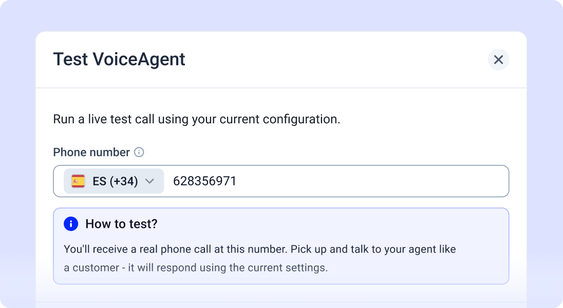 Enter your phone number and trigger a test call. You’ll receive a real call so you can speak with the agent and see how it handles a conversation.