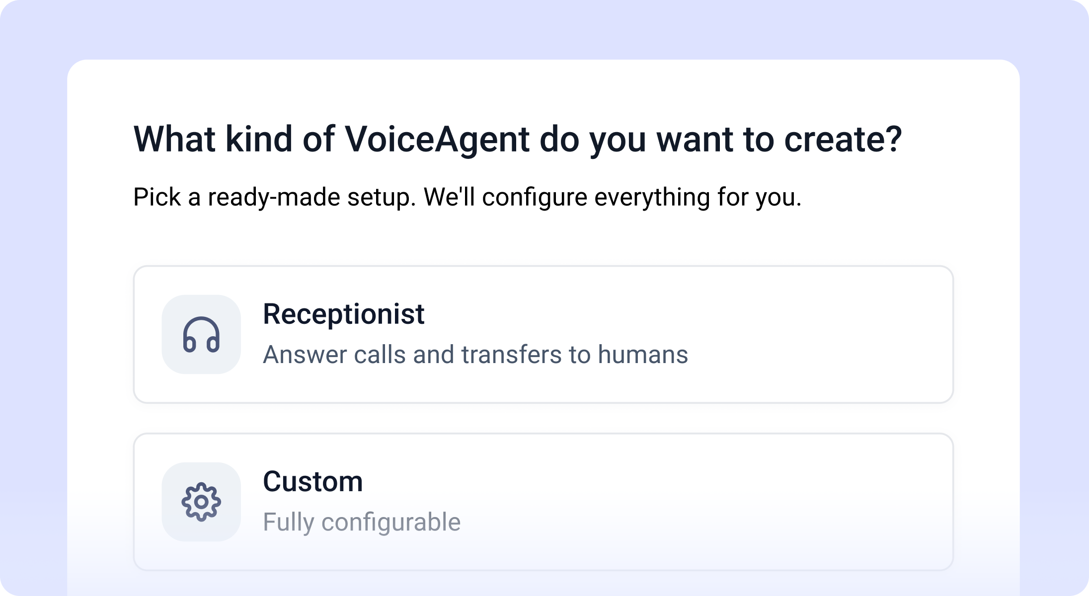 For example, a receptionist agent that answers inbound calls and transfers them to the right person when needed.