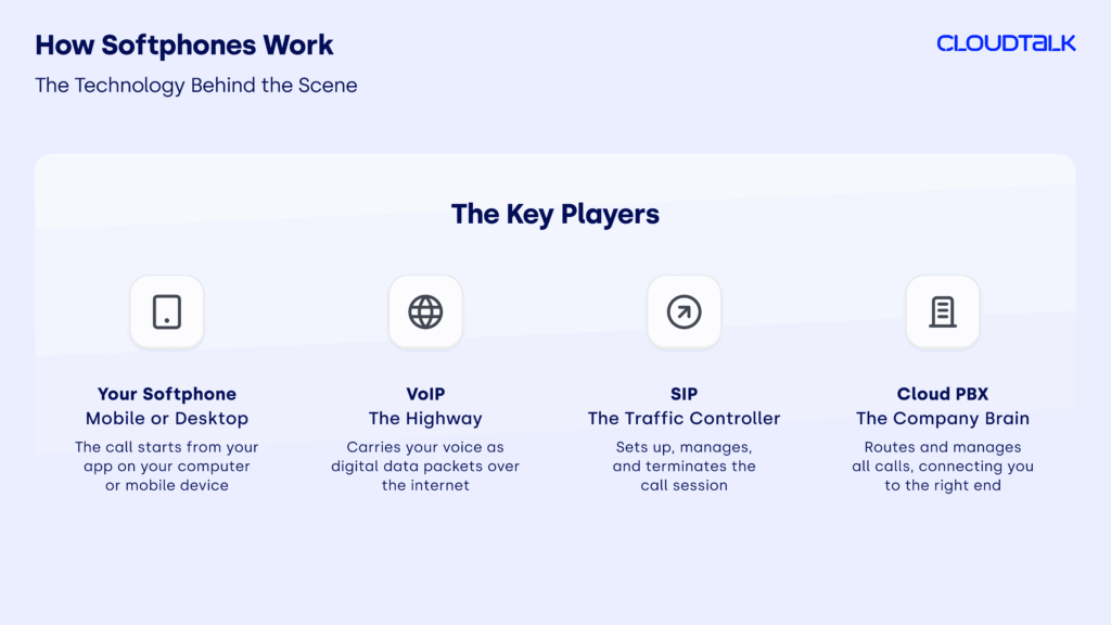 Softphones use VoIP (Voice over Internet Protocol), meaning calls travel through your internet connection instead of a phone line. All you need is: