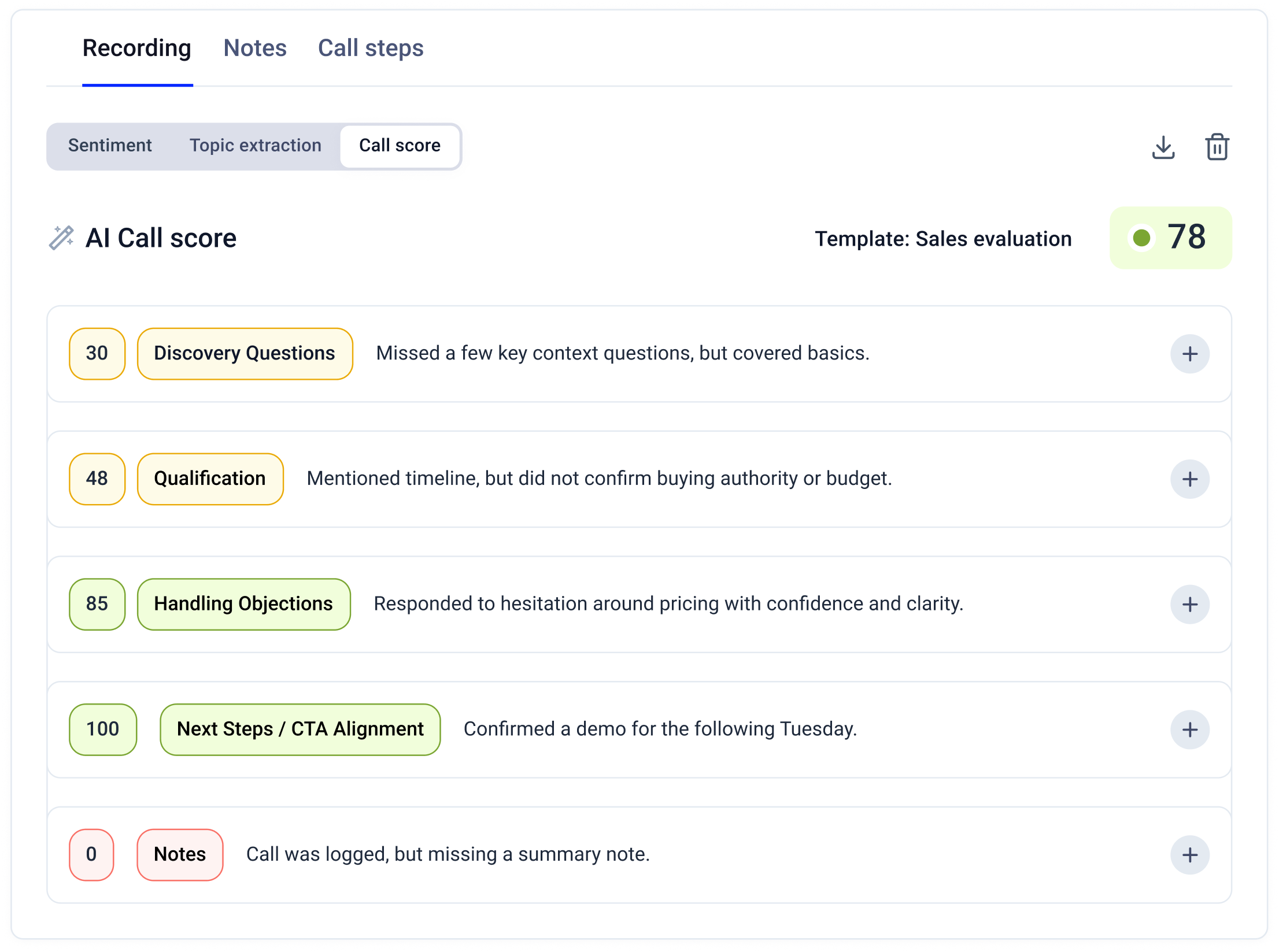 Get instant AI-powered scores on every call. Quickly evaluate agent performance across skills, playbook alignment, and compliance—or any criteria you choose.