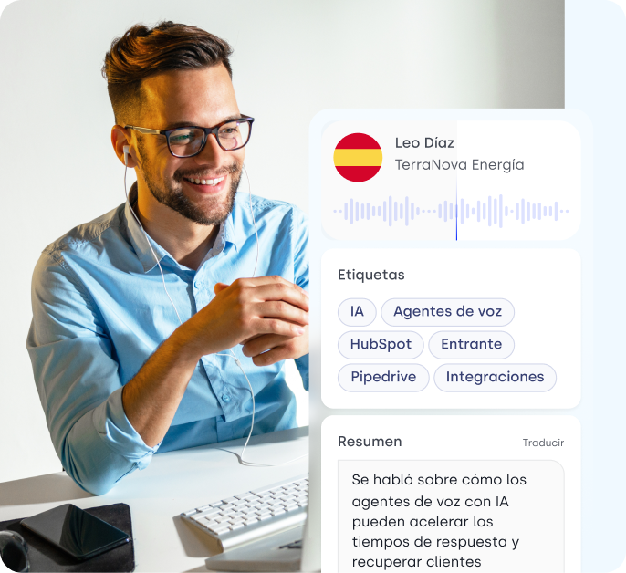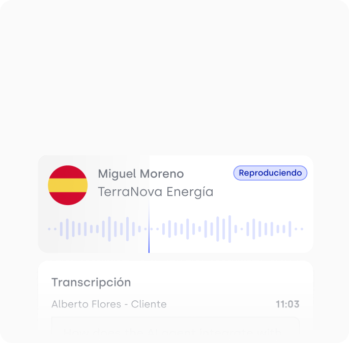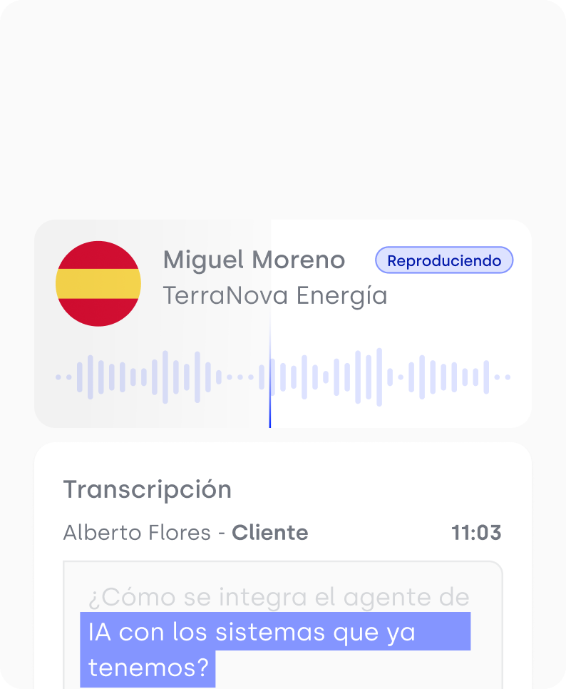 Elimina el trabajo manual y la incertidumbre. Nuestra IA transcribe, resume y analiza cada conversación para que tu equipo sepa qué se dijo, cómo se dijo y qué hacer después.
