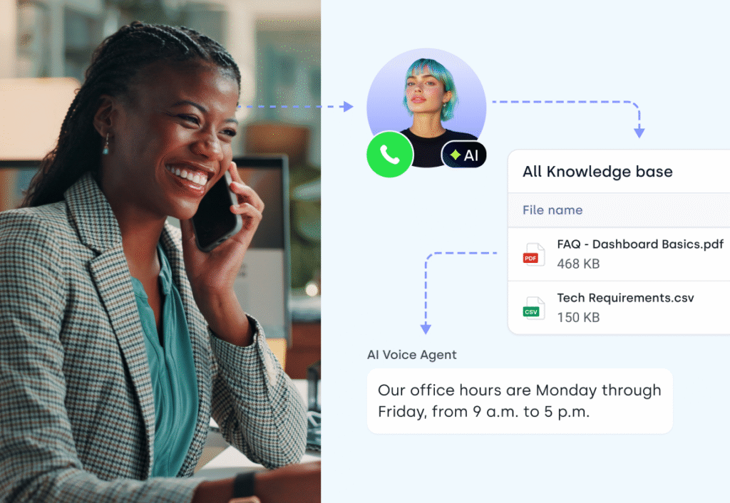 If your AI agent can’t resolve a query, it can transfer the call to a human, take a voicemail, or create a support ticket, depending on your fallback setup.